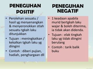 22 PENEGUHAN NEGATIF Peneguhan negatif ialah satu tindakan yang diambil dalam meningkatkan tingkah laku yang diingini. 51 Peraturan Bilik Darjah. Secara rasmi bilik darjah boleh ditakrifkan sebagai sebuah bilik di mana sekumpulan murid diajar oleh seorang guru.