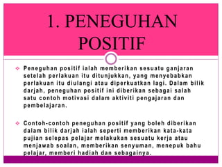 Bilik darjah merupakan tempat yang paling penting proses pengajaran dan pembelajaran. - peneguhan negatif. Menurut Brophy 1981 ciri-ciri pujian peneguhan positif yang memberi kesan ialah memuji secara ikhlas memuji dengan cepat memuji tanpa memilih kasih memuji usaha dan cuba jaya memuji tingkah laku yang spesifik memuji jawapan atau respon yang spontanContoh peneguhan positif ialah kata-kata perangsanghadiahwangganjaran dan sebagainya.