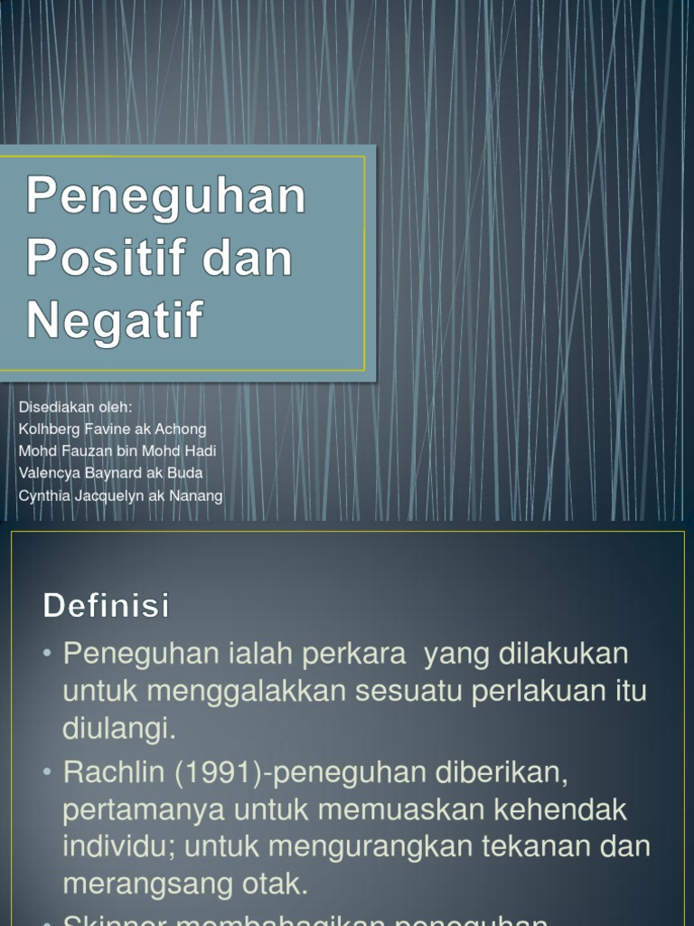 Peneguhan negatif adalah proses asas yang muncul dalam sehari-hari kita secara spontan. Masalah disiplin ini juga berpunca daripada ibu bapa yang enggan bekerjasama dengan pihak sekolah untuk menasihati anak mereka. Bagaimanakah seorang guru boleh menggalakkan Tingkah Laku positif di dalam bilik darjah.